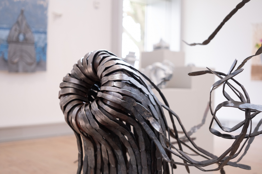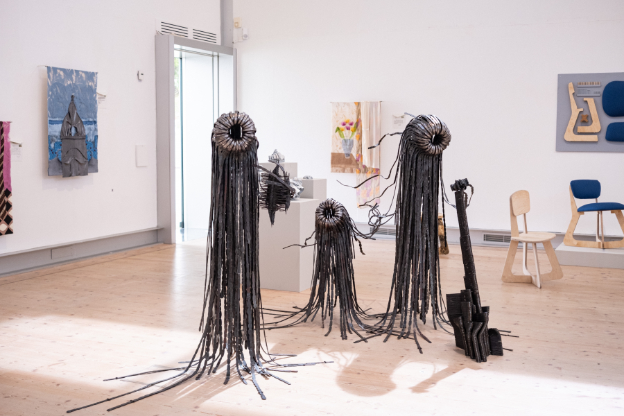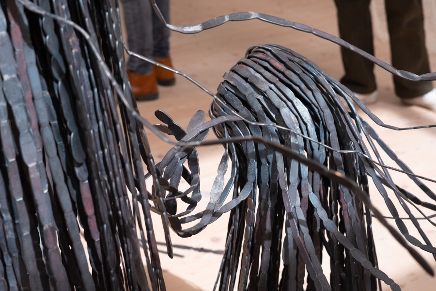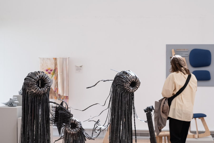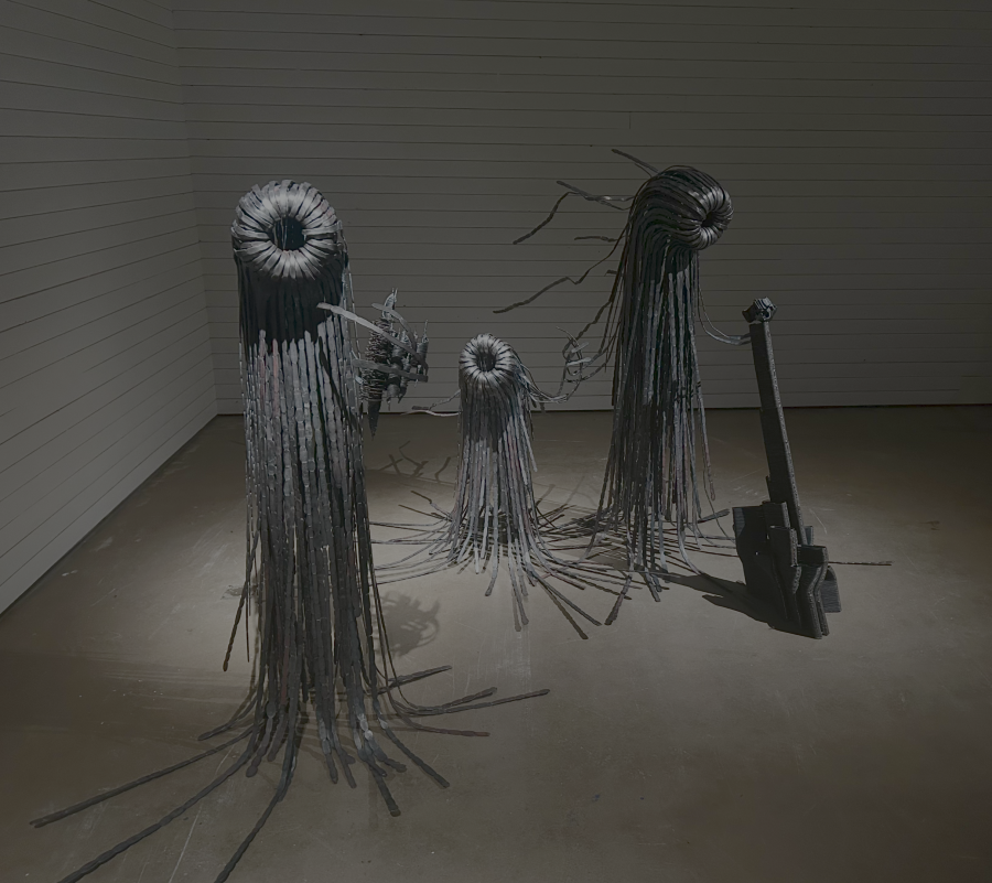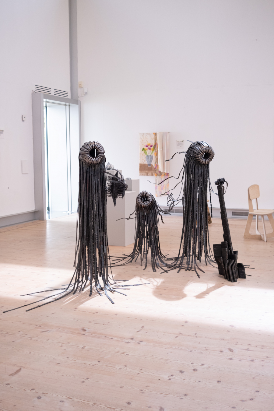 This installation displays a parent, a child and a stranger, composed with the thought of them waiting for the bus, train or tram. The stranger holding a book, the parent looking into their phone, with streams of content reaching for it from the ground. The child observes and finds it normal, because it does not know of any other reality than what it observes.