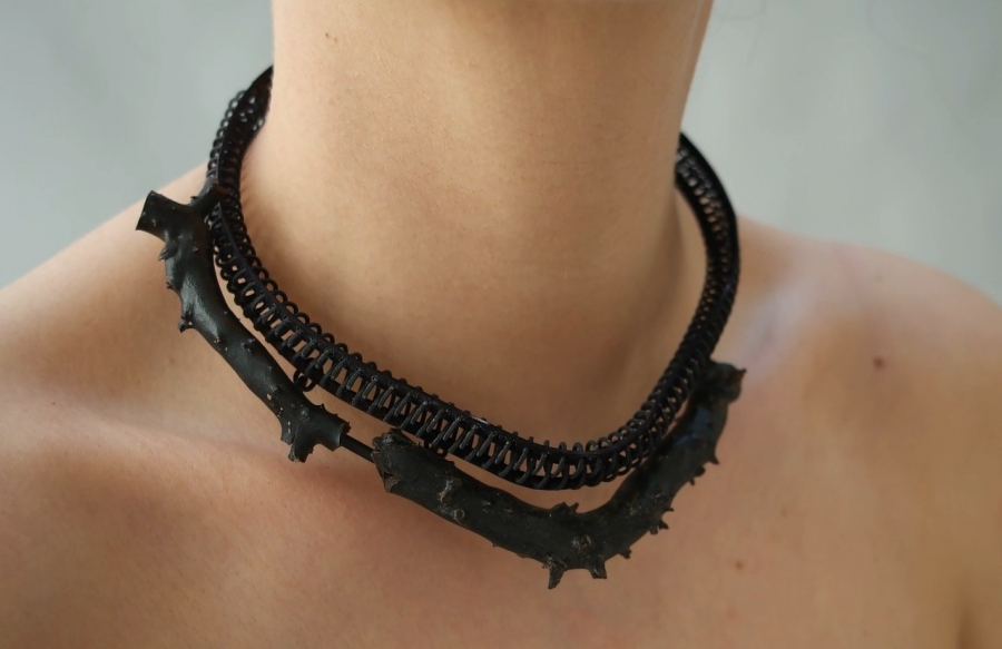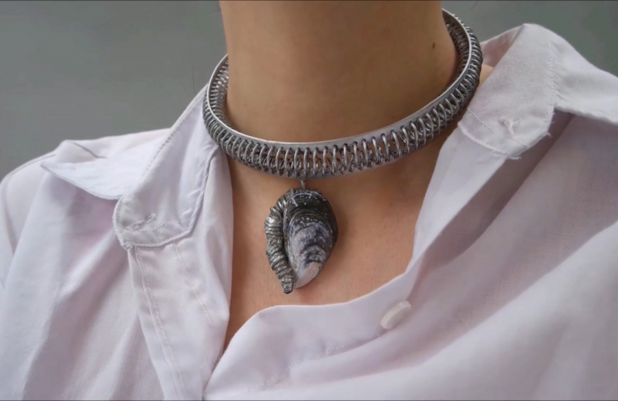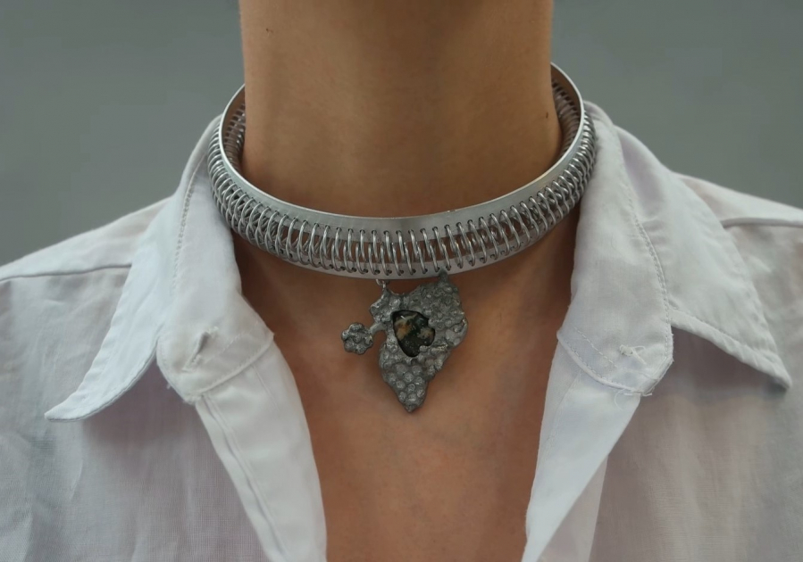 Childhood and specific scenes from it, I have found in various objects. Memories of grilles connected by spiraling coils became the starting point for a set of jewelry aiming to embody this familiar feeling. I have weaved the coils together into a chain, using it as a tool to connect. Framing stones, shells and corals. I wanted to extend this familiarity, from the object and into its physical grip on the body.