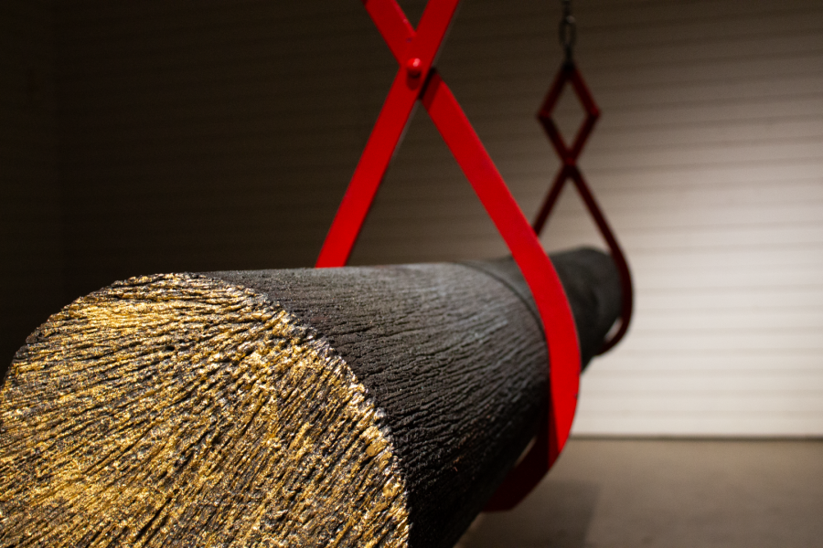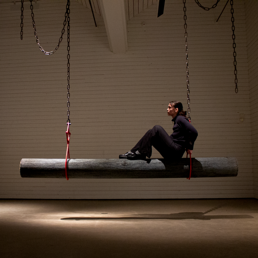 Exploration of a Swing in a Polarised Landscape is based on refl ecting our contemporary relation to the forest and forestry. An interactive swing, consisting of a log replicated in metal, embodies the play of childhood, timber tongs depict the small scale to the big scale forest industries, but also the development from a forestry by hand towards today's forest machines. The bark, grey, raw, organic. The wood, the internal, coloured in gold, the essence of the industry. With a tone of poeticness, the work discusses and explores how an artwork can be a narrator within the concept and context and investigates questions as, what attributes could an artwork have to potentially create a platform for discussion? How can associations within an artwork work as a tool of communication to the forest industry? The purpose of the work is to create a space for refl ection and discussion through an installation, where the focus is on questions regarding our forests. Where is the balance between the use of nature as an industrial resource? What does forests mean to us as individuals, and as a collective?