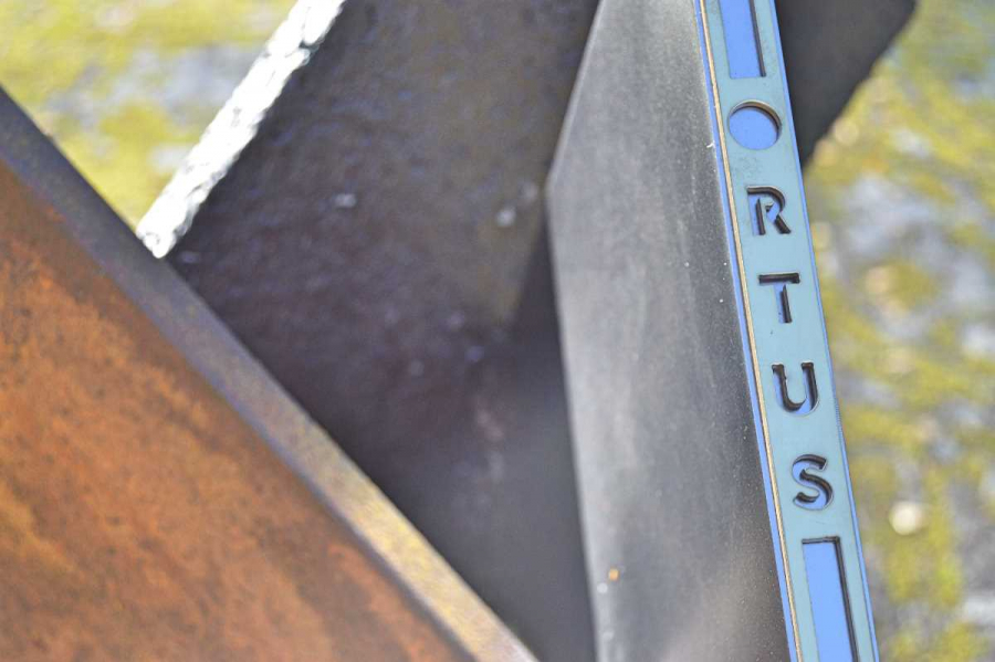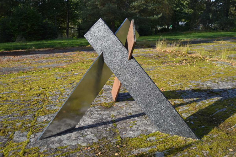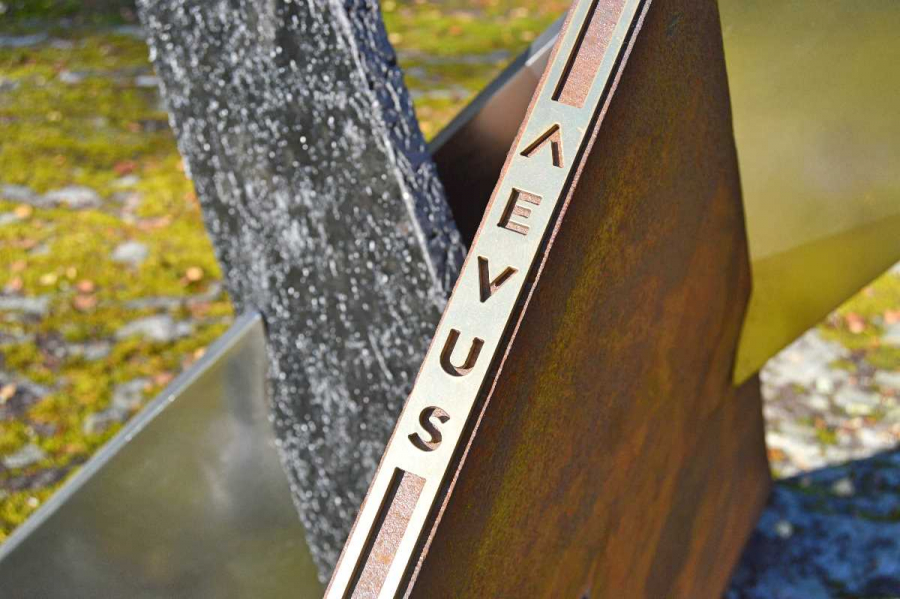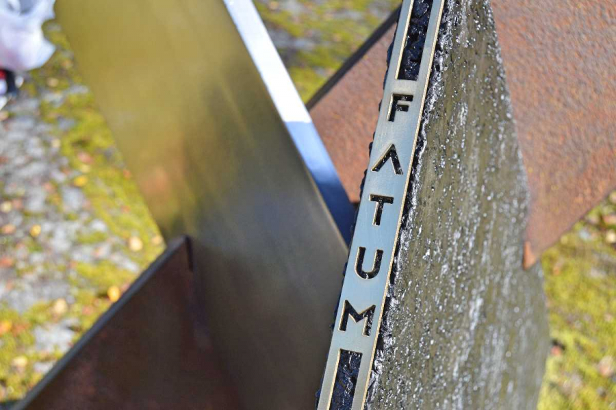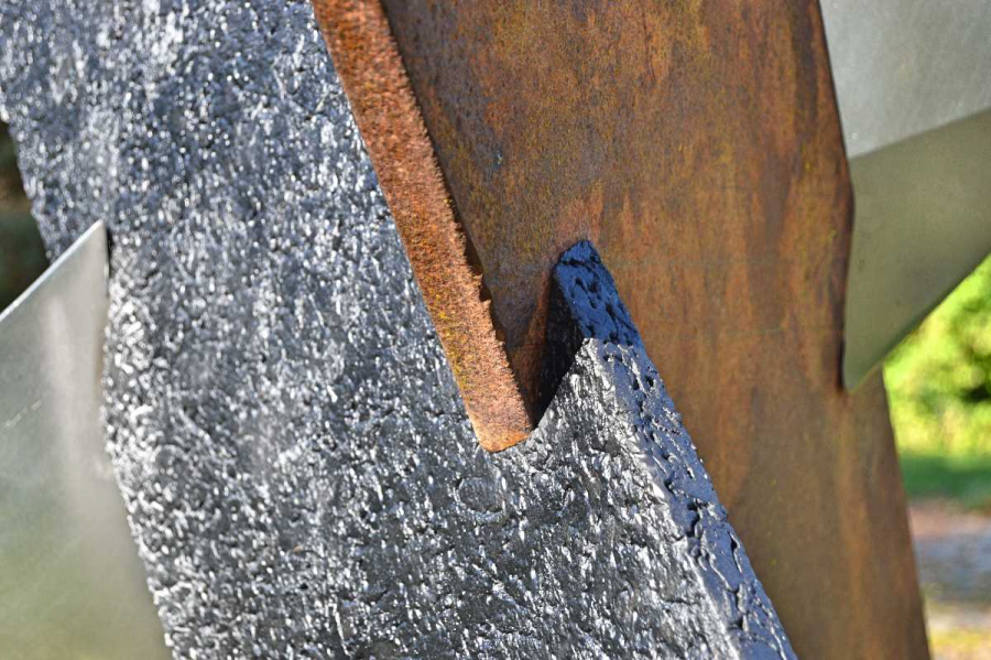 Made of three solid pieces of steel. Offset in a circle with different textures and surface treatments.