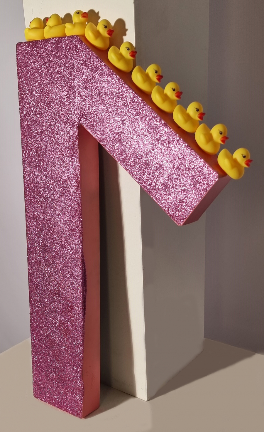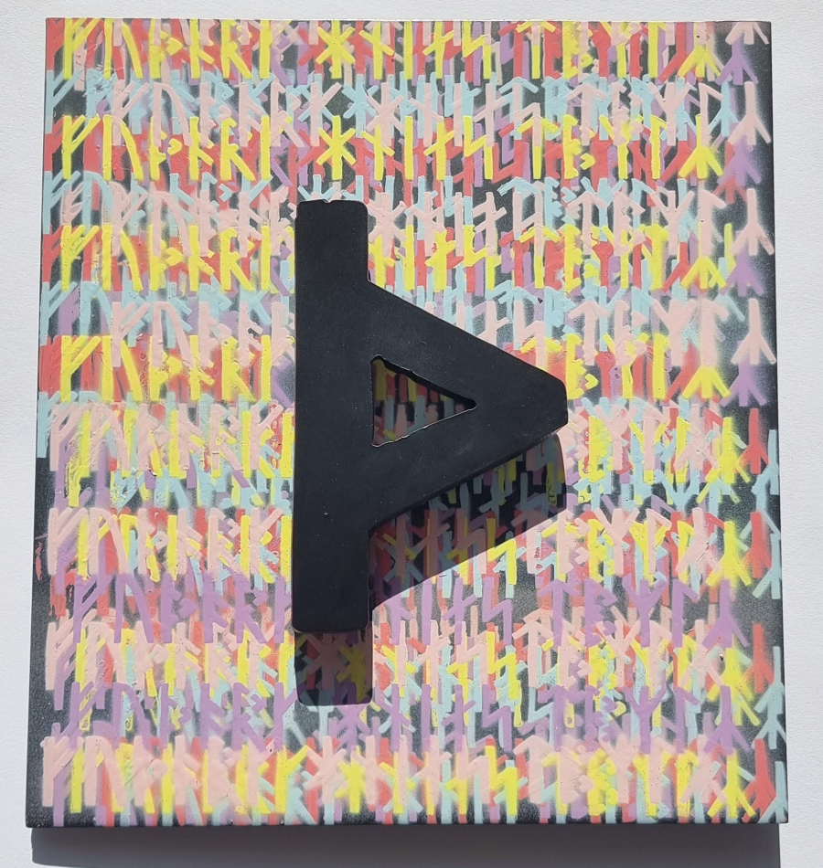 Drawing inspiration from graffiti and kitsch, I painted brightly coloured runes over and over again on metal shapes to make them become a texture. To blend them together into a background to de-emphasize the storytelling qualities of them and make them become an aesthetic element and part of the overall work without standing out as a message to be decoded.