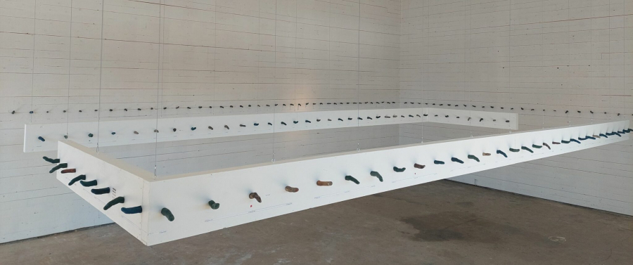 My work consists of two parts that are in dialogue with each other. The first collection, which I call with the common denominator “finger(at) counting days”, consists of 266 fingers installed in single row across the entire room. Under each finger is a specific date between August 30, 2021, and June 4, 2023. Each finger represents a day that I was actually in University Campus in Dals Långed. The fingers are either wax or bronze. Each bronze finger represents a day I was in or actually did something in the workshop. Every finger is for sale. I have set a starting price for one finger and an end price for the other. With the purchase of each finger, the price of the next finger increases by 5 SEK – demand-supply ratio (if the product has a market, then the price can be increased?). Behind this idea is my peasant logic – if the works are bought, with the sale of each individual work, the artist becomes one notch more famous, and the probability that the entire price scale of his works will increase due to this.