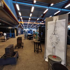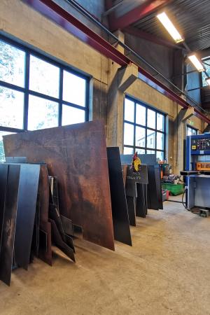 In our grinding room you'll find horizontal and vertical belt grinders, sand blaster cabinet, angle grinders, rotating file and if you want to give your art piece a certain patina you could choose from either painting it in our painting room or find a chemistry mixture that gives the expression you are seeking, we have a demo-display with tested blends, or you could try your own recipe.